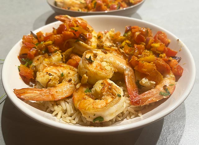 8 - Servez les crevettes en assiette, entourées de rougail tomates. Ce plat est excellent servi avec un riz thaï.